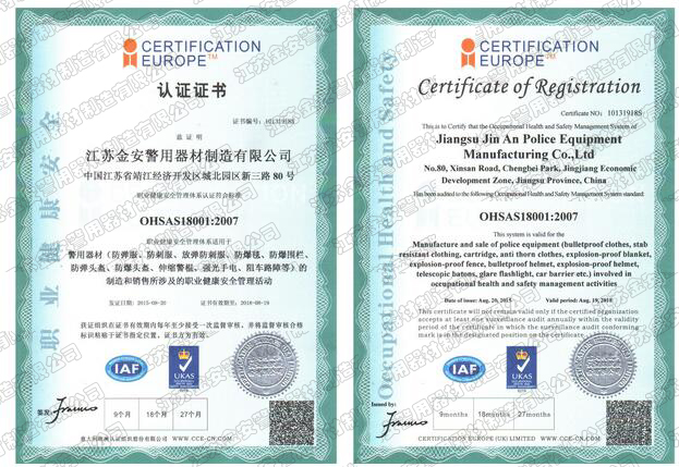第一批新型單警裝備定點生產(chǎn)企業(yè) 公安部警用裝備采購中心協(xié)議供貨單位 公安部防彈防刺服生產(chǎn)定點企業(yè) 江蘇省公安廳防彈衣入圍企業(yè) 江蘇警用裝備行業(yè)協(xié)會會員單位 中國刑事科學(xué)技術(shù)協(xié)會團(tuán)隊會員單位 中國安全防范產(chǎn)品行業(yè)協(xié)會會員單位 靖江市保安器材行業(yè)協(xié)會常務(wù)理事單位 全國警用裝備標(biāo)準(zhǔn)化技術(shù)委員會通訊委員 江蘇金安警用器材制造有限公司始創(chuàng)于九十年代初,公安部防彈防刺服生產(chǎn)定點企業(yè)、公安部警用裝備采購中心2..